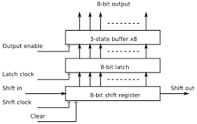 Podemos notar que possui 2 blocos distintos.Shift Register como foi explicado acima, mais o bloco de LATCH, que faz a trava dos dados, este circuito completo possui as entradas de controle que explicarei todas para melhor entendermos o circuito.